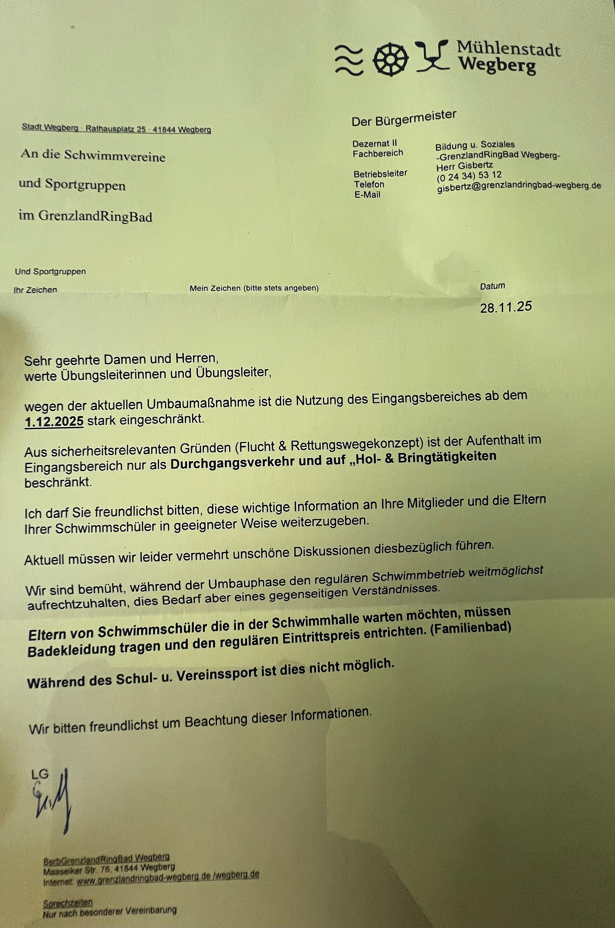 Hier findet Ihr alle Übungszeiten sowie den Bahnen-/Beckenbelegunsplan im Hallenbad Wegberg: